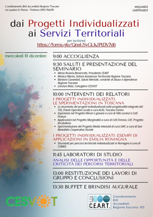 Dai Progetti Individualizzati ai Servizi Territoriali è il titolo di un seminario realizzato da CEART (Coordinamento Enti Accreditati Regione Toscana) in collaborazione con CESVOT. Il seminario, che si terrà il 10 dicembre a Firenze, approfondisce lo strumento dei progetti individualizzati, in ambito sociale e sanitario, che si stanno sperimentando in Regione Toscana. Saranno presentati alcuni progetti relativi a minori e giovani, alle marginalità e al gioco d’azzardo.